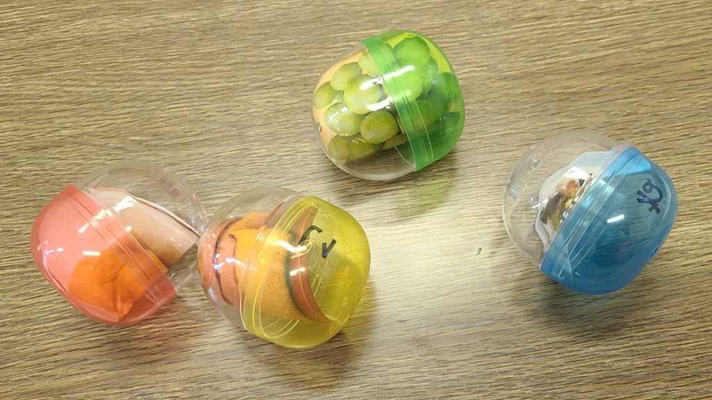 テーブルに置いてある紙には4色のまるがあるので、カプセルの色と合わせておいていくと、正しい順に文字を並べられます。