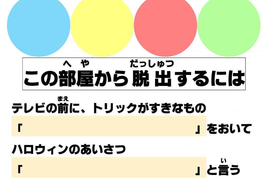 テーブルには「この部屋から脱出するには」という紙が置いてありました。どうやら、トリックがすきなものをさがして、あいさつを言えばよさそうです。