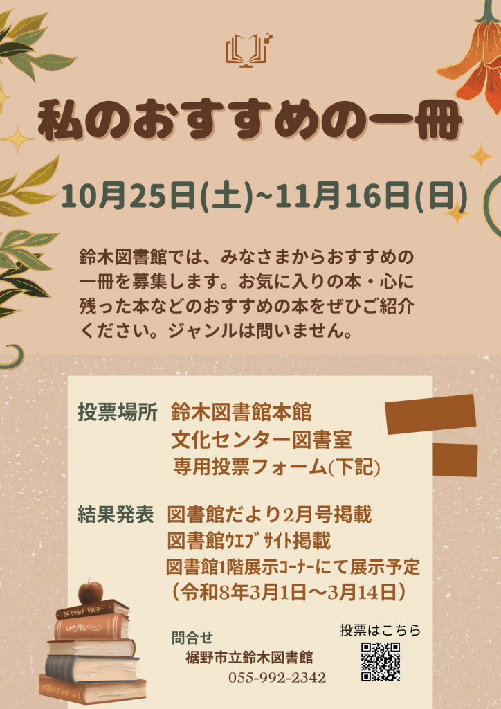 鈴木図書館では、秋の読書月間にちなみ、みなさんのおすすめの一冊を募集します。