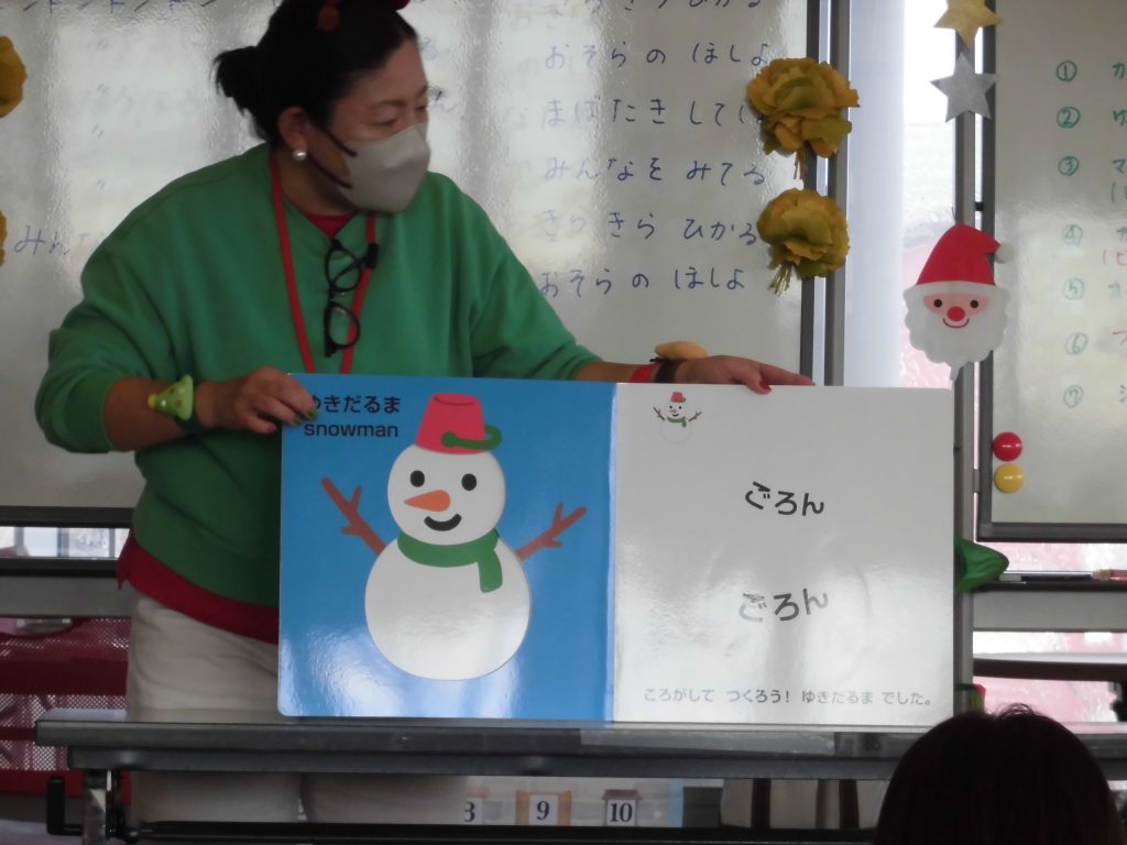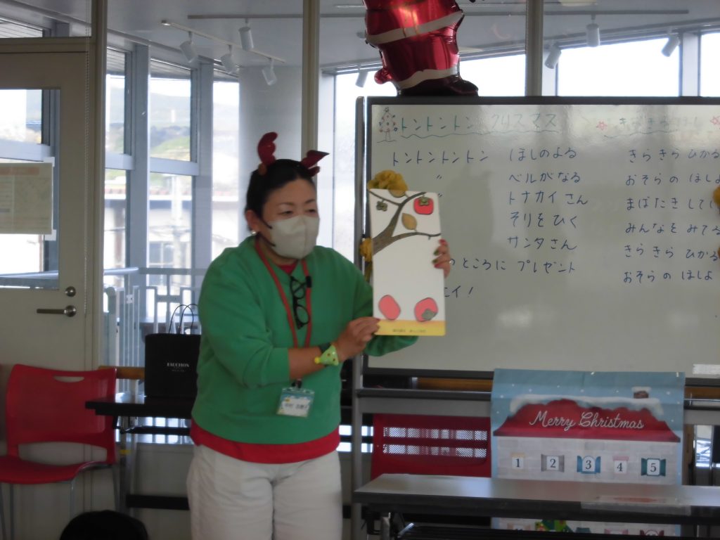 大型絵本「クリスマスのかくれんぼ」では、絵本の前に集まって講師の声かけに楽しく答える様子が見られました!
