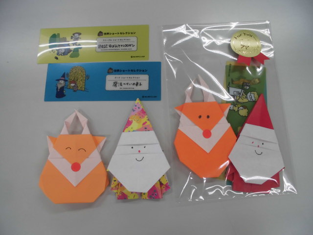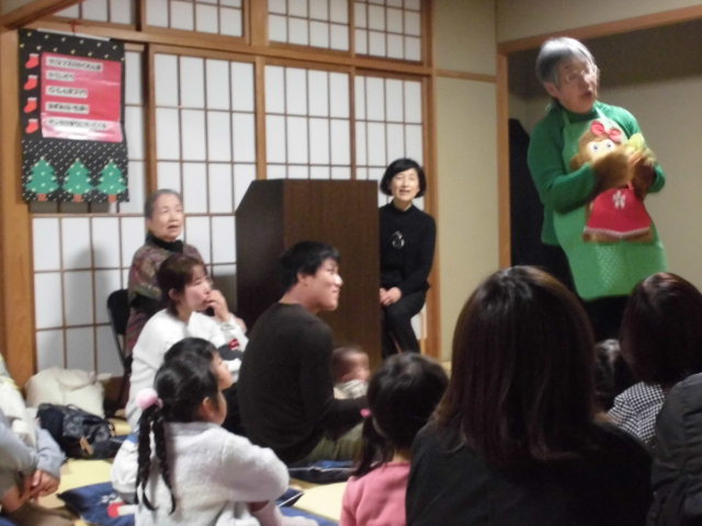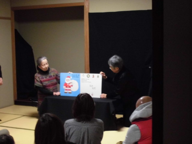 おはなしボランティア「たんぽぽ」の皆さんによる、大型絵本やエプロンシアターなど、クリスマスを装う催しとなりました。なかでもブラックパネルシアター「サンタが町にやってくる」では、みなさん真っ暗な中でおはなしの世界に入り込んで聞いていたのが印象的でした。