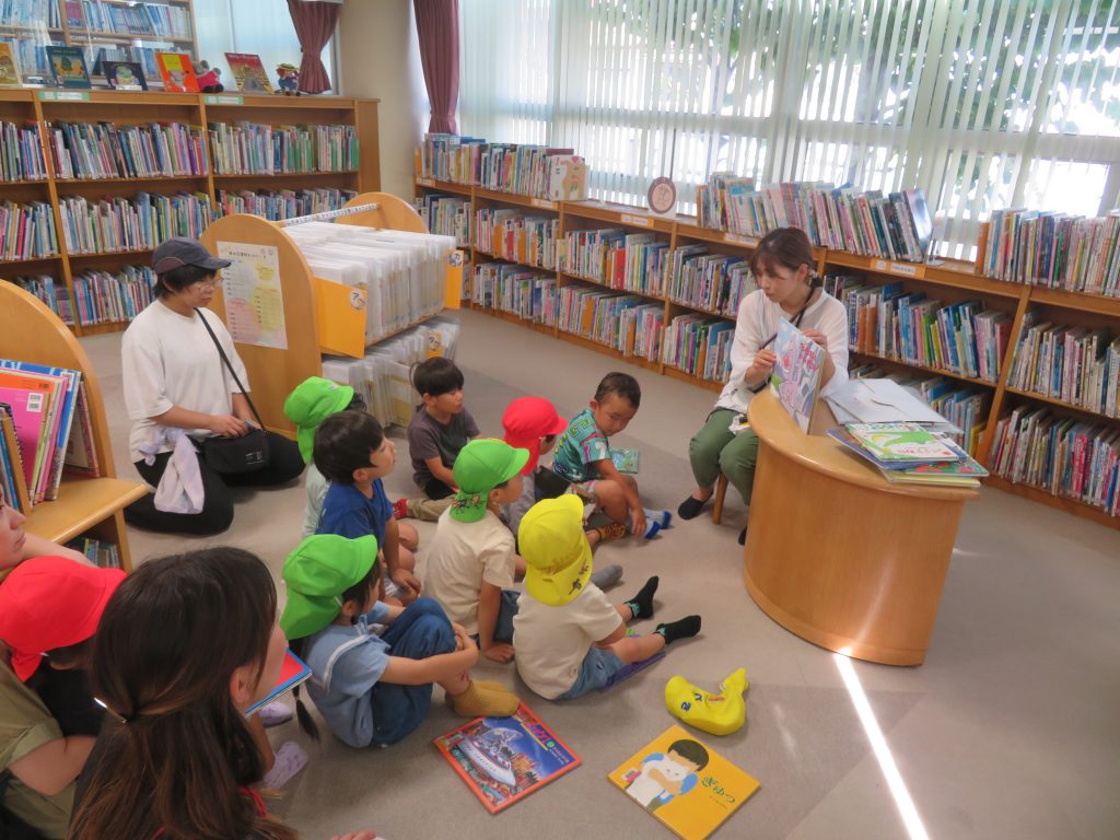 9月26日(金)に裾野市立須山幼稚園の園児のみなさん9名が図書館に遊びに来てくれました。館内見学のほか、普段は入ることが出来ない「閉架書庫」の見学や、児童コーナー「おはなしのへや」でそれぞれが好きな絵本を選び、先生と一緒に楽しそうに本を開いていました。そして、先生による紙芝居などの読み聞かせを行った後、自分で選んだ絵本1冊をカウンターで借りるという体験をしました。 みなさんの楽しそうな笑顔がたくさん見られました。 須山幼稚園のみなさん今日はありがとうございました。また遊びに来てくださいね!