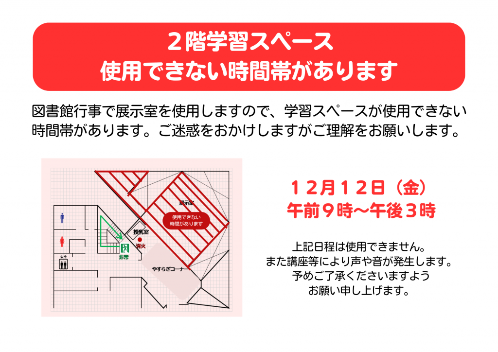 12月12日(金)は、「子育て講座 絵本とおしゃべりのへや」を開催するため、2階北側の学習スペースが使用できません。また、講座等により音や声がしますので、予めご了承ください。【使用できない時間】12月12日(金) 午前9時00分~午後3時00分ご迷惑をおかけしますがご理解ご協力をお願いします。