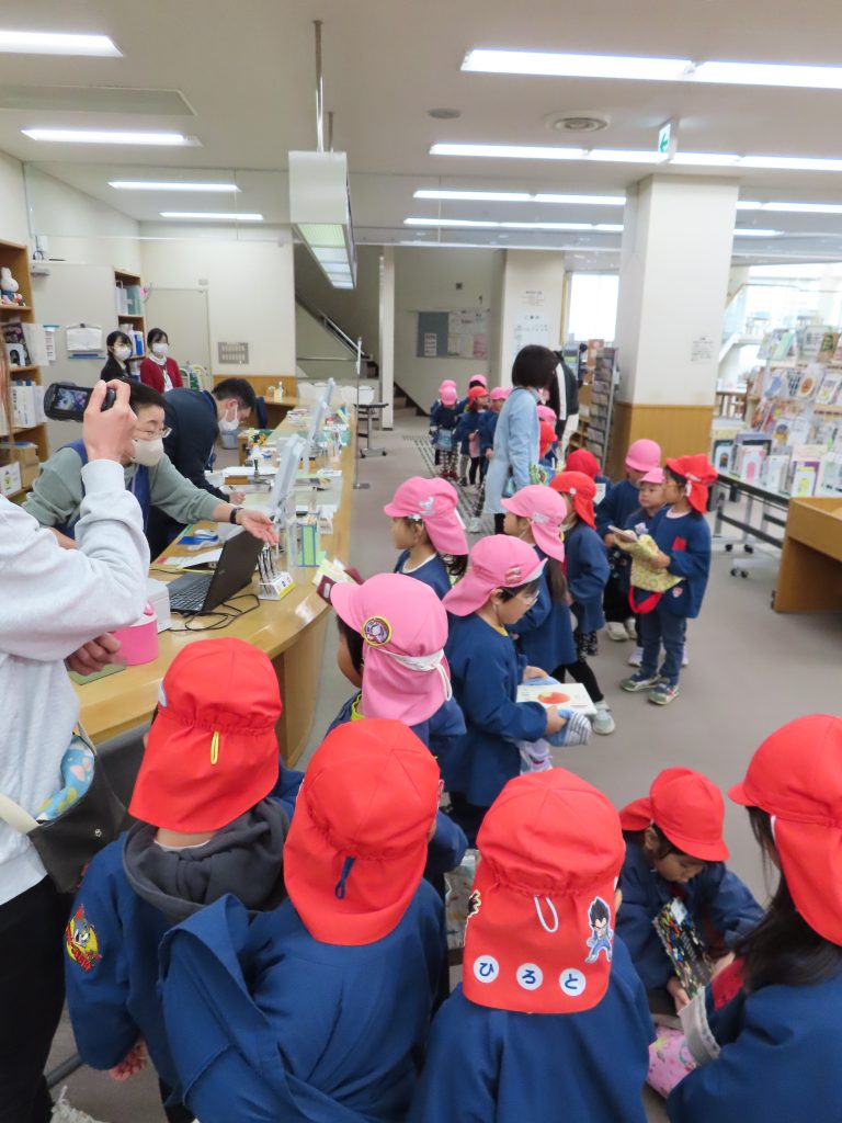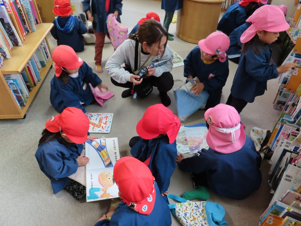 今回は、それぞれがお気に入りの絵本を見つけ、一人一冊ずつ窓口で借りる体験をしました。その後は、用意したお部屋でみんなでにぎやかにお弁当タイム!